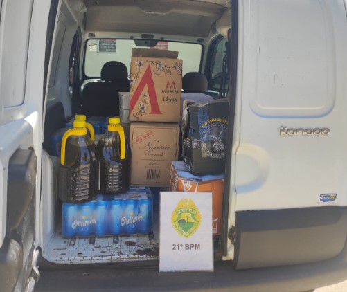 Os policiais abordaram um veículo Renault/Kangoo branco que apresentava a traseira visivelmente rebaixada. Durante a fiscalização, o condutor afirmou estar retornando da Argentina. Na verificação do interior do carro, foram encontradas aproximadamente 42 garrafas de vinho, 12 de uísque, 76 litros de cerveja e cinco galões de óleo.