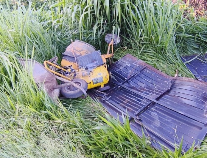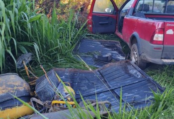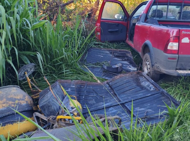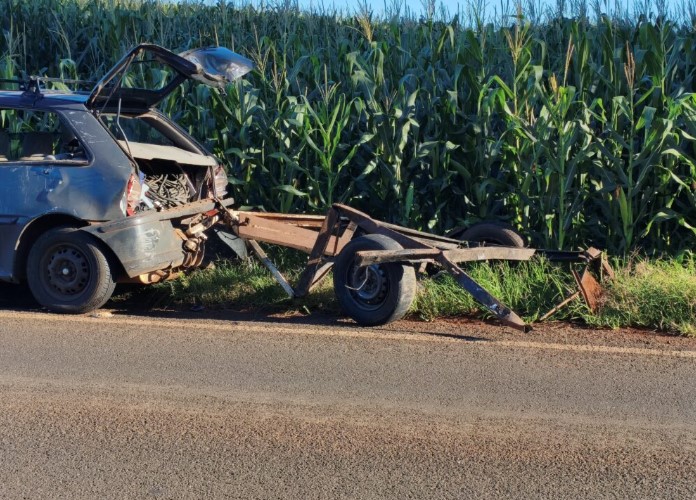 Com a força do impacto, a carretinha foi completamente destruída, e as ferramentas ficaram espalhadas às margens da rodovia. A picape Strada também sofreu danos significativos na parte frontal.