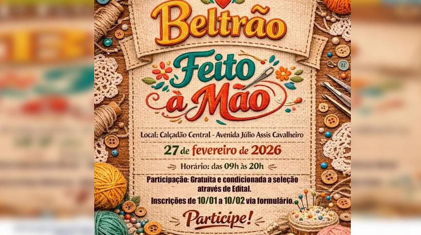 As inscrições estão abertas e vão até dia 10 de fevereiro, pelo formulário disponível. A iniciativa é da Prefeitura de Beltrão e Departamento Municipal de Cultura para conectar artistas, fortalecer a economia criativa e celebrar o que é feito com as mãos.