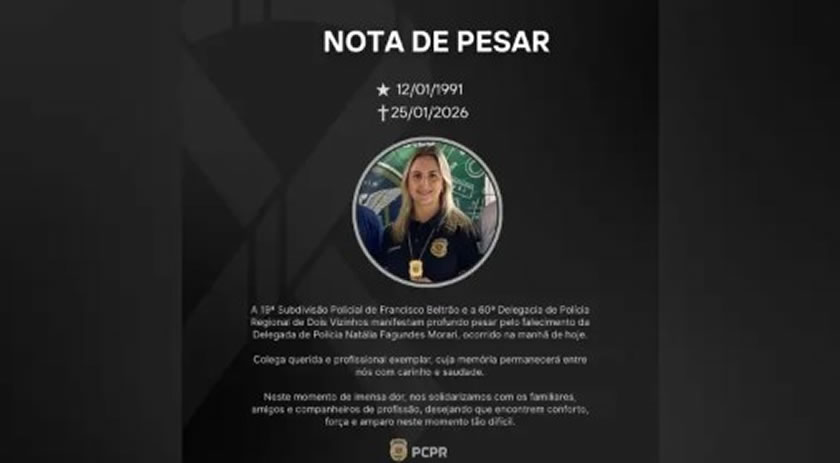 "A 19ª Subdivisão Policial de Francisco Beltrão e a 60ª Delegacia de Polícia Regional de Dois Vizinhos manifestam profundo pesar pelo falecimento da Delegada de Polícia Natália Fagundes Morari, ocorrido na manhã de hoje.