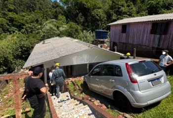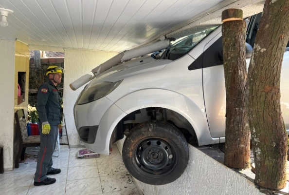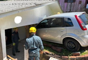 Um Ford Fiesta ficou "entalado" em uma casa após invadir a moradia na manhã de domingo (09), no bairro Colina Verde, em Cunha Porã, no Oeste catarinense.