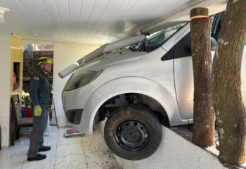 Carro invade residência e fica "entalado" em estrutura em Cunha Porã