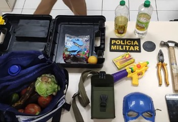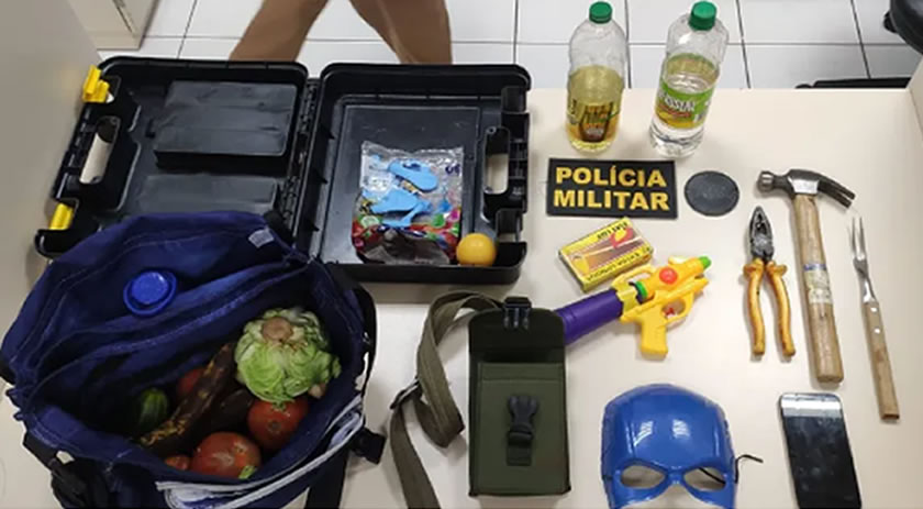 Segundo a PM, com ele foram encontrados objetos que eram citados nas ameaças nas redes sociais, como legumes, um martelo e um liquido inflamável. Todo material foi apreendido.