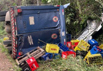 Um caminhão com placas de Chapecó saiu da pista em uma curva, e capotou ao lado da rodovia. O motorista, um homem de 44 anos, queixava-se de tontura, mas não tinha ferimentos aparentes.