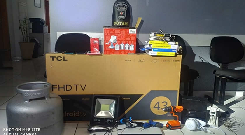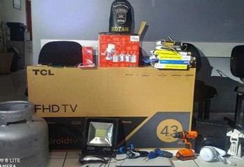 A equipe PM então solicitou autorização para busca domiciliaar, encontrando uma televisão de 43 polegadas com registro de furto dia 05/09/22, além disso foram localizados notebook, celulares, tablet, caixa de som, luminárias, máquinas de cortar cabelo e de barbear, parafusadeiras, botijão de gás, torneira elétrica, entre outros, somando 22 objetos.