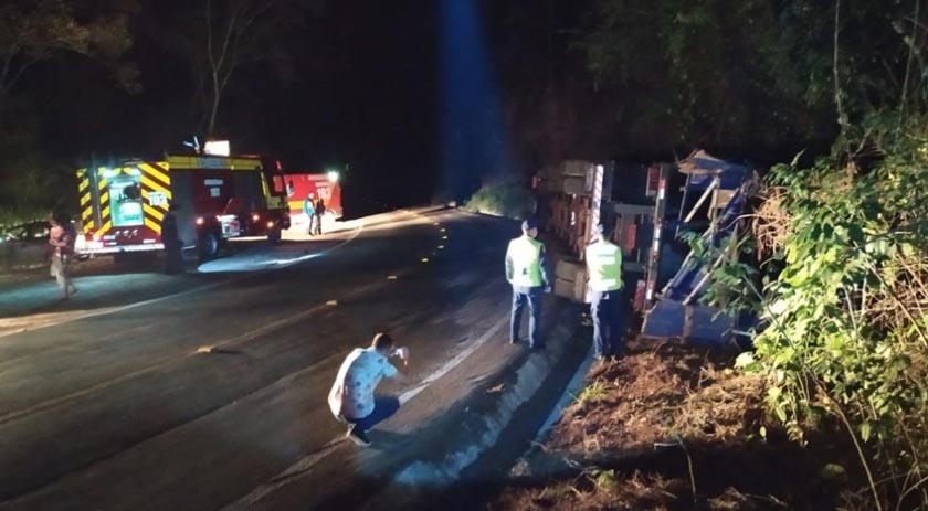 No local as equipes se depararam com uma carreta, emplacada em Arvorezinha/RS e carregada com insumos agrícolas. O veículo havia tombado e o motorista já estava fora, às margens da rodovia. Conforme os Bombeiros, o homem, de 35 anos, estava consciente e orientado, apresentando ferimento na perna direita e referindo dores na região do tórax, quadril e crânio.