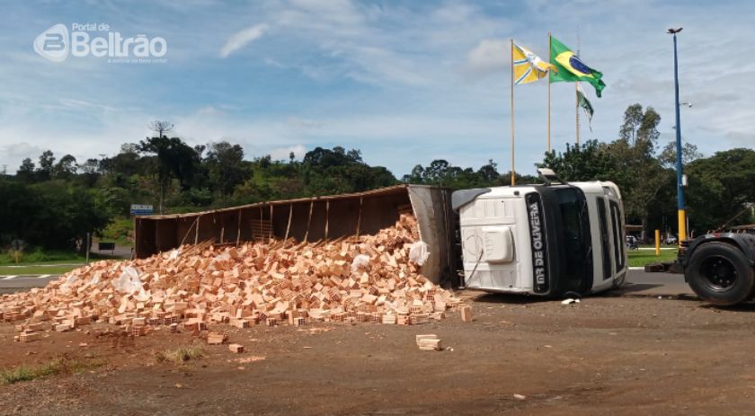 No final da manhã desta quinta-feira (30), uma carreta carregada de tijolos acabou tombando no trevo da PRE, em Francisco Beltrão.