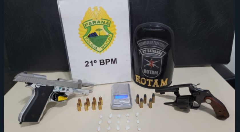 Na noite deste sábado (01) uma equipe ROTAM juntamente com equipe RPA após denúncias de tráfico de drogas em um estabelecimento comercial localizado no prolongamento da avenida Júlio assis cavalheiro, realizou a abordagem do local sendo localizado 20 buchas de cocaína juntamente com um revolver calibre .32 escondidos no interior do bar, também em revista pessoal foi localizado com o segurança do local uma pistola 9mm municiada, sendo assim foram encaminhados até a 19° SDP para providências cabíveis.