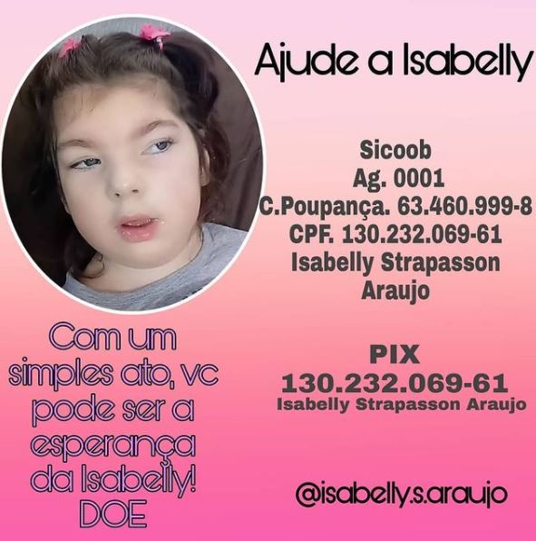 Para contribuir com a saúde de Isabelly, as pessoas podem doar através de uma Vaquinha Online (clique aqui), feita pela família. Há, ainda, o PIX 130.232.069-61, e uma poupança disponível: