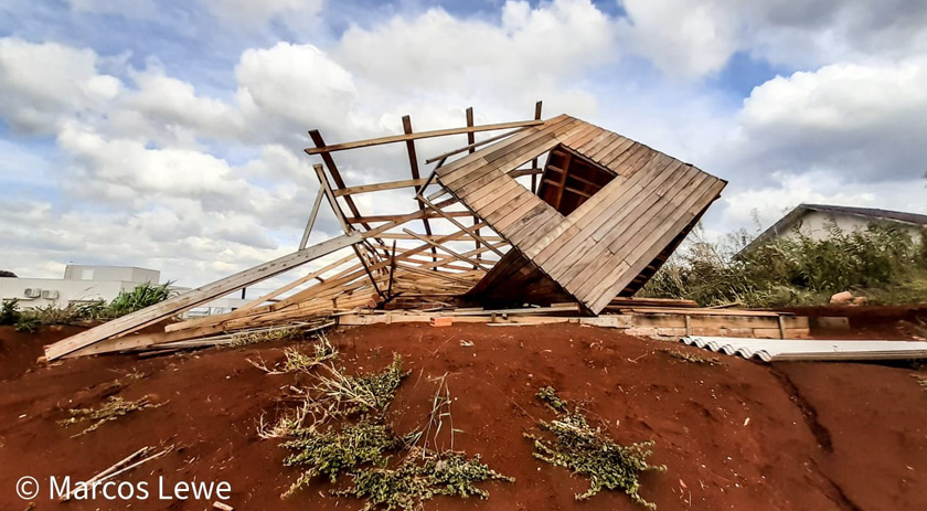 Uma casa ficou destruída com os fortes ventos que atingem a região nesta sexta-feira (28), no Bairro Santa Rita em São Miguel do Oeste.