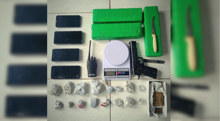 Diante da visualização do ilícito, foi dado voz de abordagem ao indivíduo e os policiais entraram na residência. Nas buscas, foram encontrados 2,907 quilogramas de maconha, uma balança de precisão, um simulacro de arma de fogo e um rádio comunicador.