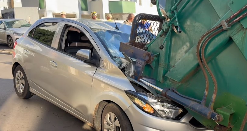 De acordo com informações apuradas no local, um Chevrolet Onix seguia pelo binário quando o motorista teve a visão ofuscada pelo sol e não percebeu a presença de um caminhão de coleta de lixo à sua frente. Sem tempo para frear, o veículo atingiu a traseira do caminhão, destruindo sua parte frontal.