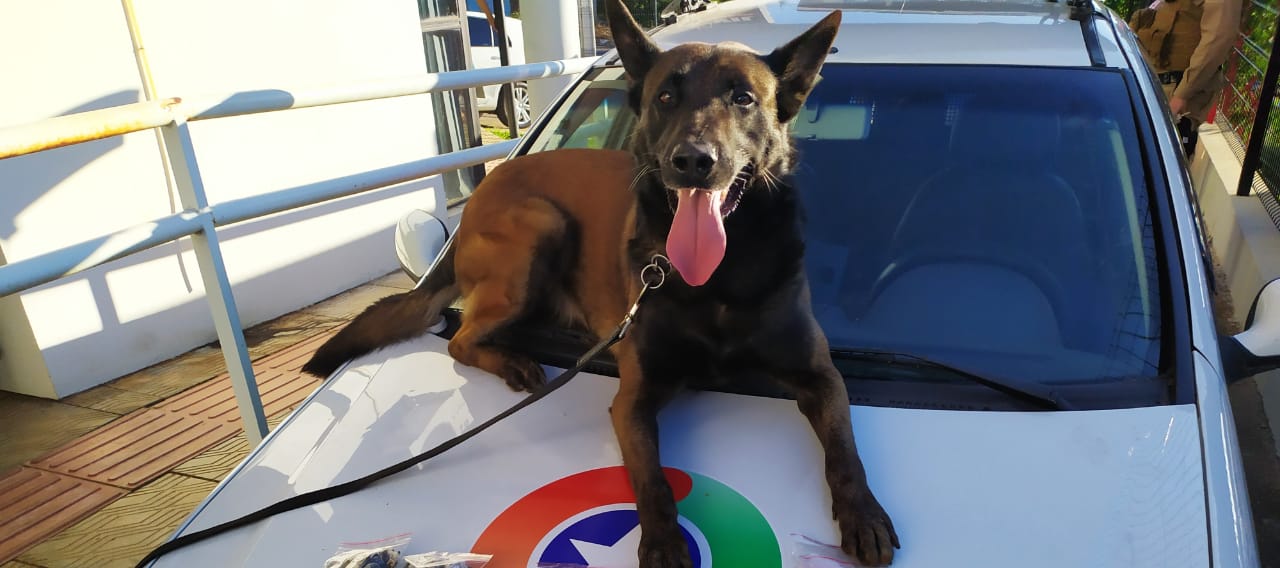Em razão das dificuldades das buscas, o CANIL da Polícia Militar prestou apoio e o cão Axel encontrou o entorpecente escondido próximo ao forro da residência.