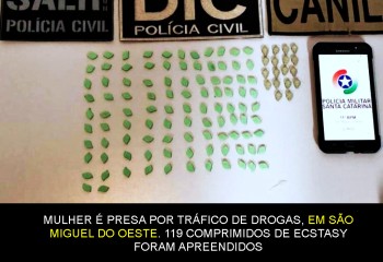 Entenda o caso A ação que foi desencadeada nesta data é resultado de uma investigação da DICfron de São Miguel do Oeste/SC que apurou o comércio de ecstasy nesta cidade. Com base nas informações colhidas no decorrer da investigação, a Polícia Civil representou ao Poder Judiciário pela ordem de busca e apreensão na residência da investigada. A ordem foi cumprida hoje e teve como resultado a apreensão de 119 (cento e dezenove) comprimidos de ecstasy.