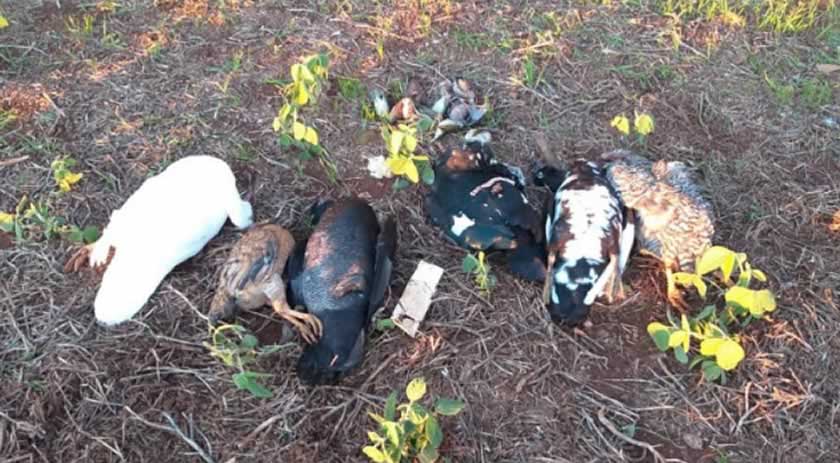 No local foi constatado que vários animais domésticos entre galinhas e patos, juntamente com animais silvestres, entre eles, canários e pombas, estavam mortos próximo a uma lavoura.