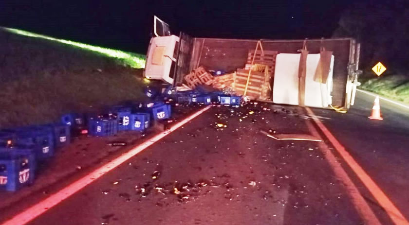Caminhão carregado com garrafas tomba na PR-280