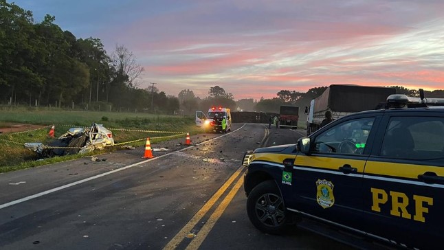 Duas pessoas morreram em um grave acidente de trânsito na madrugada desta sexta-feira (19), por volta das 4 horas, no km 259 da BR-373, em Prudentópolis no Paraná. Segundo a Polícia Rodoviária Federal, a colisão frontal envolveu um Gol com placas de São José do Rio Preto (SP) e um caminhão Volvo e placas de Guamiranga (PR) tracionando semi reboques carregados com farelo de soja.