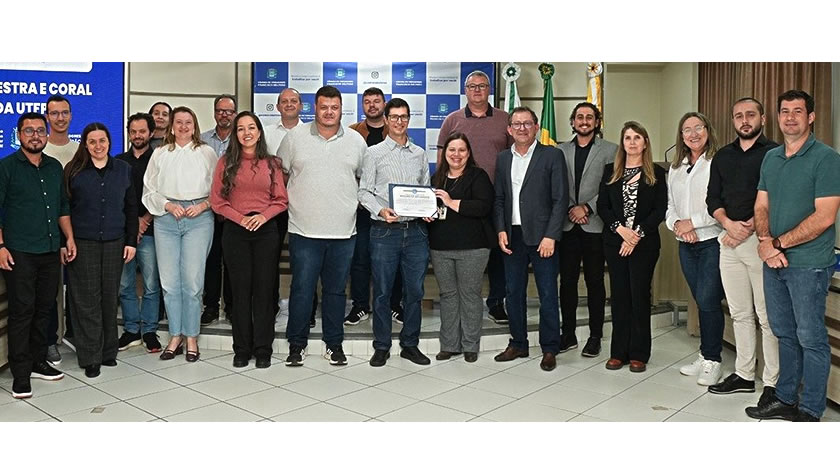 Para celebrar os 12 anos de atuação, a Câmara de Vereadores de Francisco Beltrão homenageou com a Moção de Aplausos a Orquestra e Coral da UTFPR (Universidade Federal Tecnológica do Paraná), campus Francisco Beltrão, através de iniciativa do vereador Silmar Gallina. A concessão da honraria foi aprovada por unanimidade. A entrega aconteceu na sessão desta terça-feira (23). Além dos vereadores, prestigiaram a sessão o Maestro Mauro Cislag, a professora Niciane Ruthes, diretora de relações empresariais e comunitárias, que representou o diretor geral do campus, Paulo Varela, que está em viagem, outros professores e integrantes da orquestra e coral.