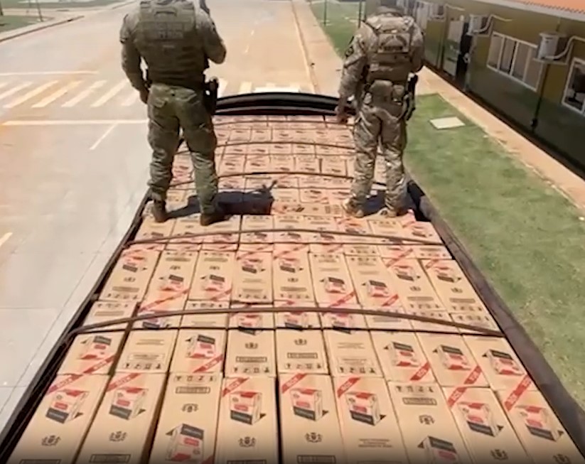 Em buscas no local, foi localizado sobre plantação de soja o caminhão com 500 caixas de cigarros. Estima-se prejuízo ao crime de R$ 1,5 milhão.
