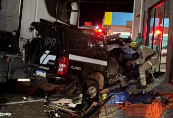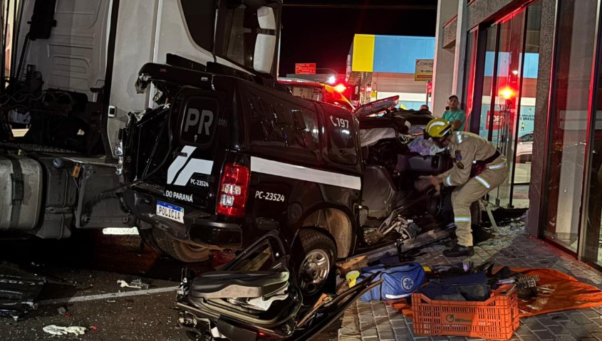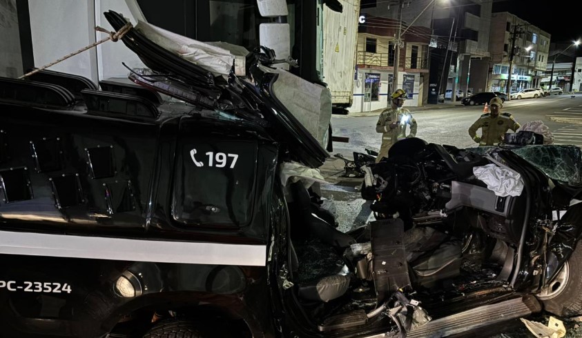 Um grave acidente foi registrado por volta das 2h45 desta terça-feira (4), no centro de Coronel Vivida, envolvendo uma viatura da Polícia Civil e um caminhão no cruzamento das ruas Clevelândia e Major Estevão Ribeiro do Nascimento. Os policiais civis Giovanni Roberto Barbiero, de 32 anos, condutor do veículo, e Lucas Lopes de Carvalho, de 29, ficaram presos às ferragens e foram resgatados após mais de uma hora de trabalho intenso das equipes do Corpo de Bombeiros e do Samu.