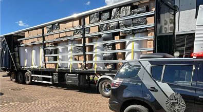 Diante da suspeita, foi aberta a carroceria do veículo, onde os policiais encontraram cerca de 700 caixas de cigarros, totalizando aproximadamente 35 mil pacotes oriundos do Paraguai, além de 21 bags de arroz.