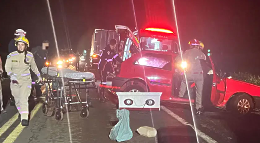 A colisão envolveu um veículo Volkswagen Gol e um caminhão. De acordo com as primeiras informações apuradas no local, no Gol estava uma pessoa que sofreu ferimentos leves.