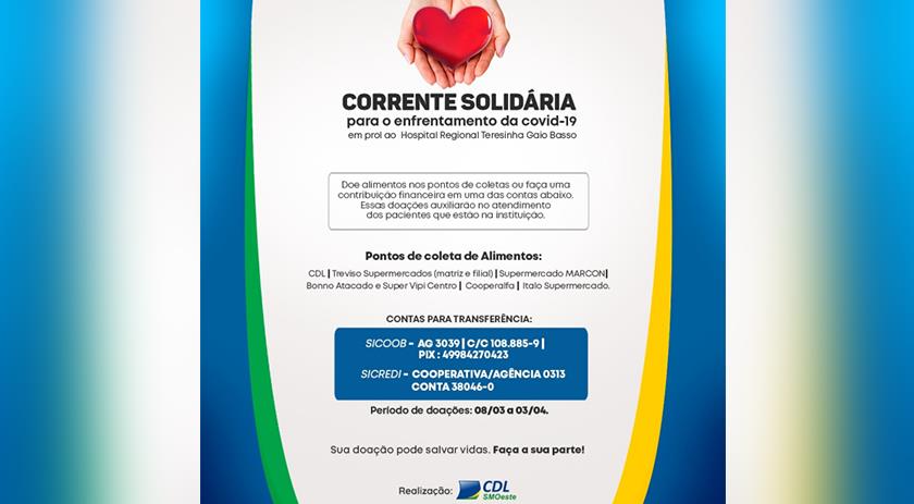 A CDL de São Miguel do Oeste sensibilizada pela situação caótica vivenciada pelo sistema de saúde público, acometido pelo rápido avanço do contágio provocado pelo Covid-19, começou no dia de hoje uma campanha aberta à comunidade e associados que visa arrecadar recursos financeiros e alimentos para o Hospital Regional Terezinha Gaio Basso.