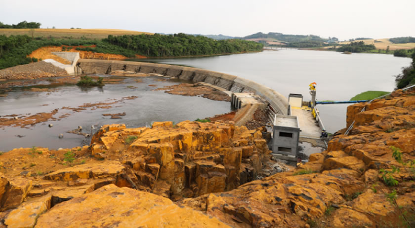 FUNCIONAMENTO DA PCH – A usina aproveita uma curva fechada natural existente no curso do rio Chopim para a criação do reservatório, formado com o represamento das águas por uma barragem em forma de arco. Ela foi construída em concreto compactado com rolo (CCR) e soleira vertente livre, com comprimento de 392,78 metros.