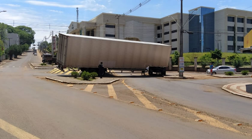 Na manhã desta quarta-feira (10), uma carreta, ao tentar realizar uma manobra na rotatória da Avenida União da Vitória, sentido trevo para Itapejara do Oeste, nas proximidades da Unisep, acabou subindo na calçada e encavalando no canteiro central.