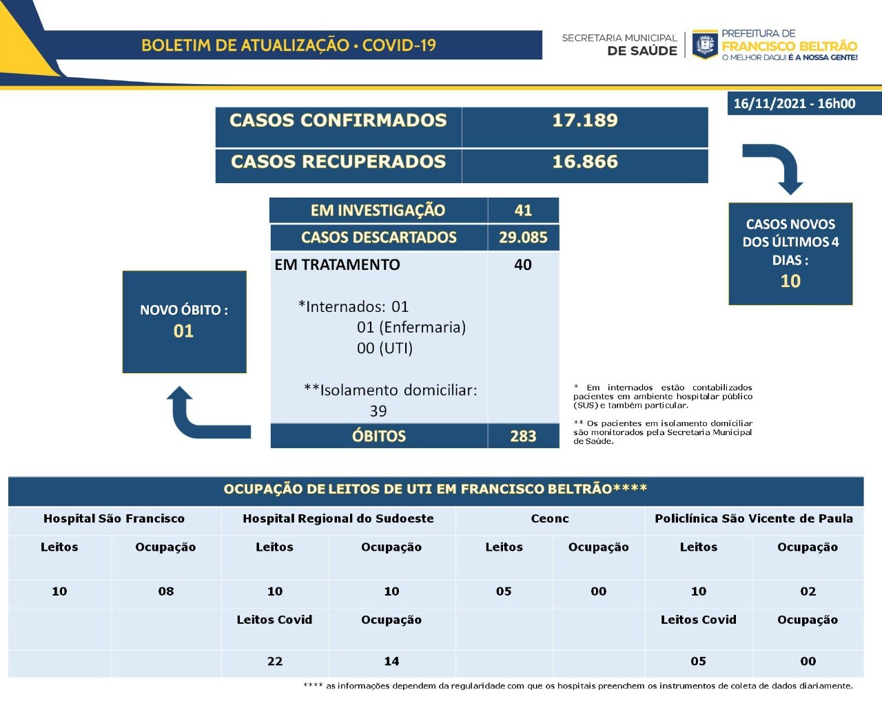 O novo boletim do Covid-19 divulgado pela secretaria de Saúde de Francisco Beltrão, nesta terça-feira (16/11), traz os novos números do Covid-19. Foram registrados 10 novos caso de Coronavírus. Vale destacar que os números de hoje refletem os últimos três dias, devido o feriadão.