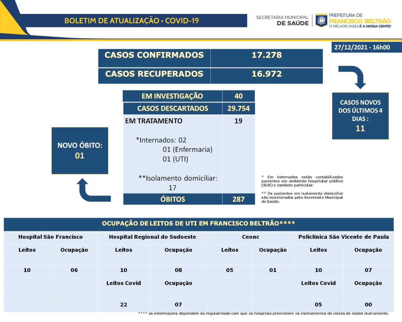 A secretaria municipal de Saúde de Francisco Beltrão divulgou nesta segunda-feira (27/12), o novo boletim com os números da Covid-19 no município. Um homem de 60 anos morreu devido as complicações da doença. 11 novos casos foram confirmados nas últimas 96 horas.