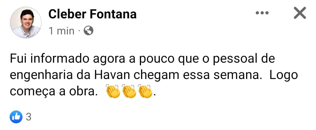 De acordo com a publicação feita por Cleber Fontana o início das obras começa em breve. Confira a publicação.