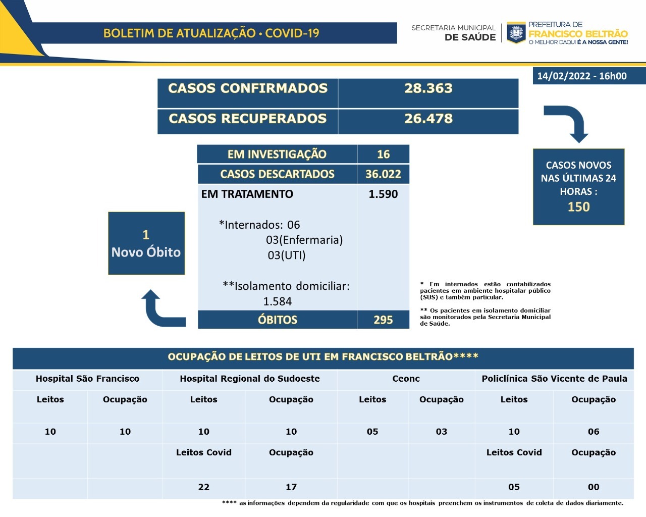 Nesta segunda-feira (14/02) o novo boletim divulgado pela Secretaria Municipal de Saúde de Francisco Beltrão traz um novo óbito por Covid-19. A morte é de um homem de 73 anos, com comorbidades.
