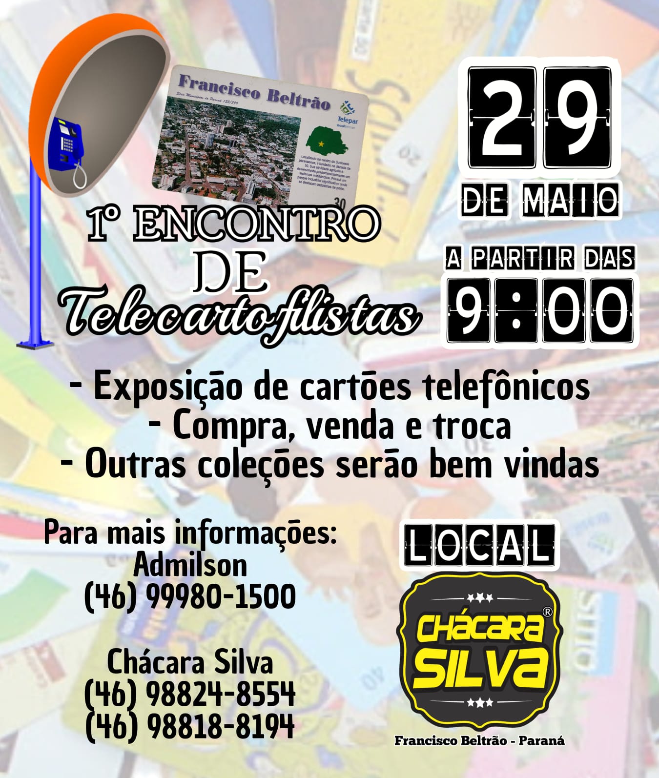 Está marcado para acontecer na Chácara Silva no dia 29 de Maio o 1° Encontro de Telecartofilistas e Colecionadores em Geral. A programação começa às 09 da manhã e no local haverá exposição de cartões telefônicos; compra, venda e troca destes itens.