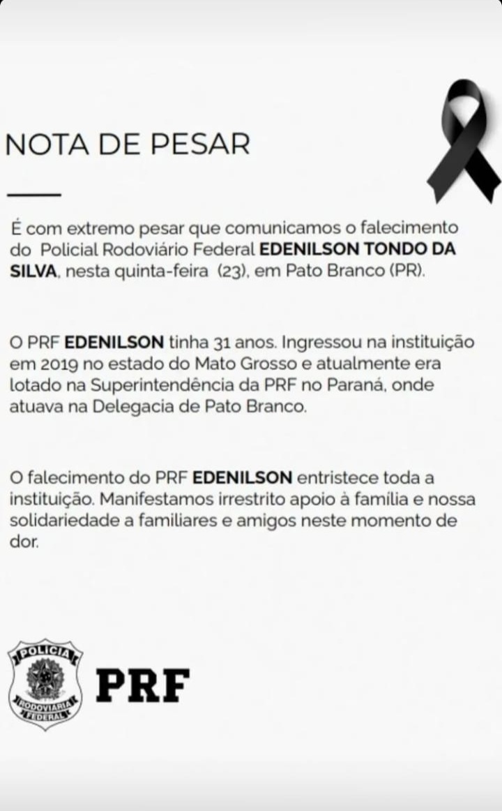 No final da tarde de quinta-feira (23) a Polícia Rodoviária Federal (PRF) comunicou em suas redes sociais o falecimento de Edenilson Tondo da Silva.