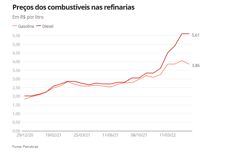 Por lá, a gasolina teve queda nas últimas três semanas, por conta da limitação do ICMS aprovada pelo Congresso Nacional. A proposta teve origem na Câmara, onde foi aprovada com o objetivo de reduzir os preços, principalmente, dos combustíveis e da conta de luz em ano eleitoral.